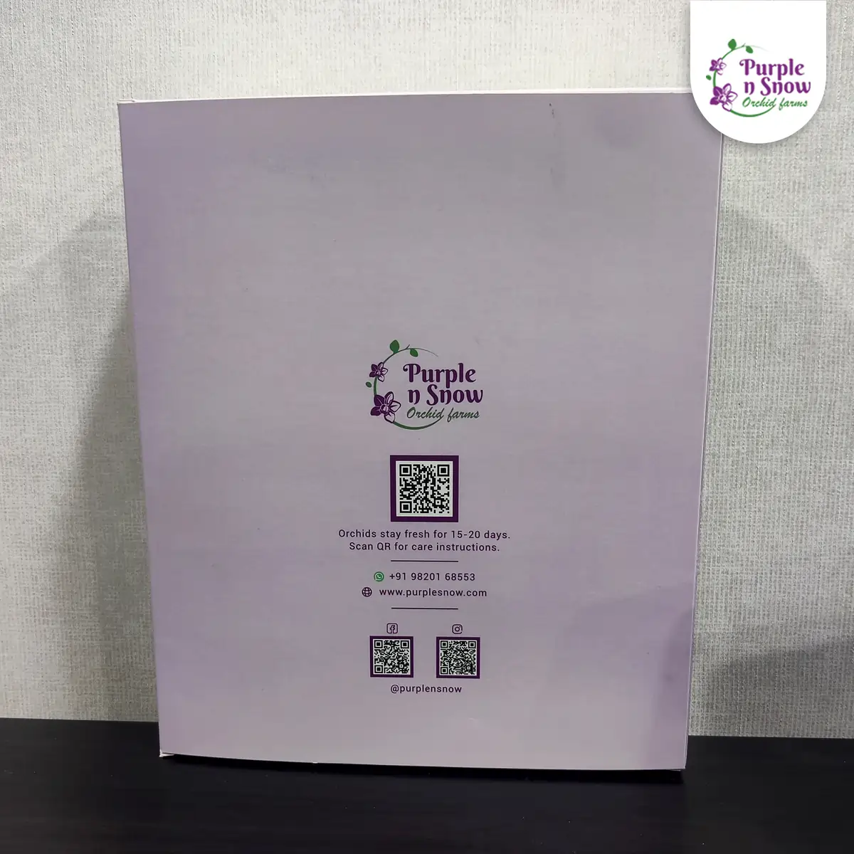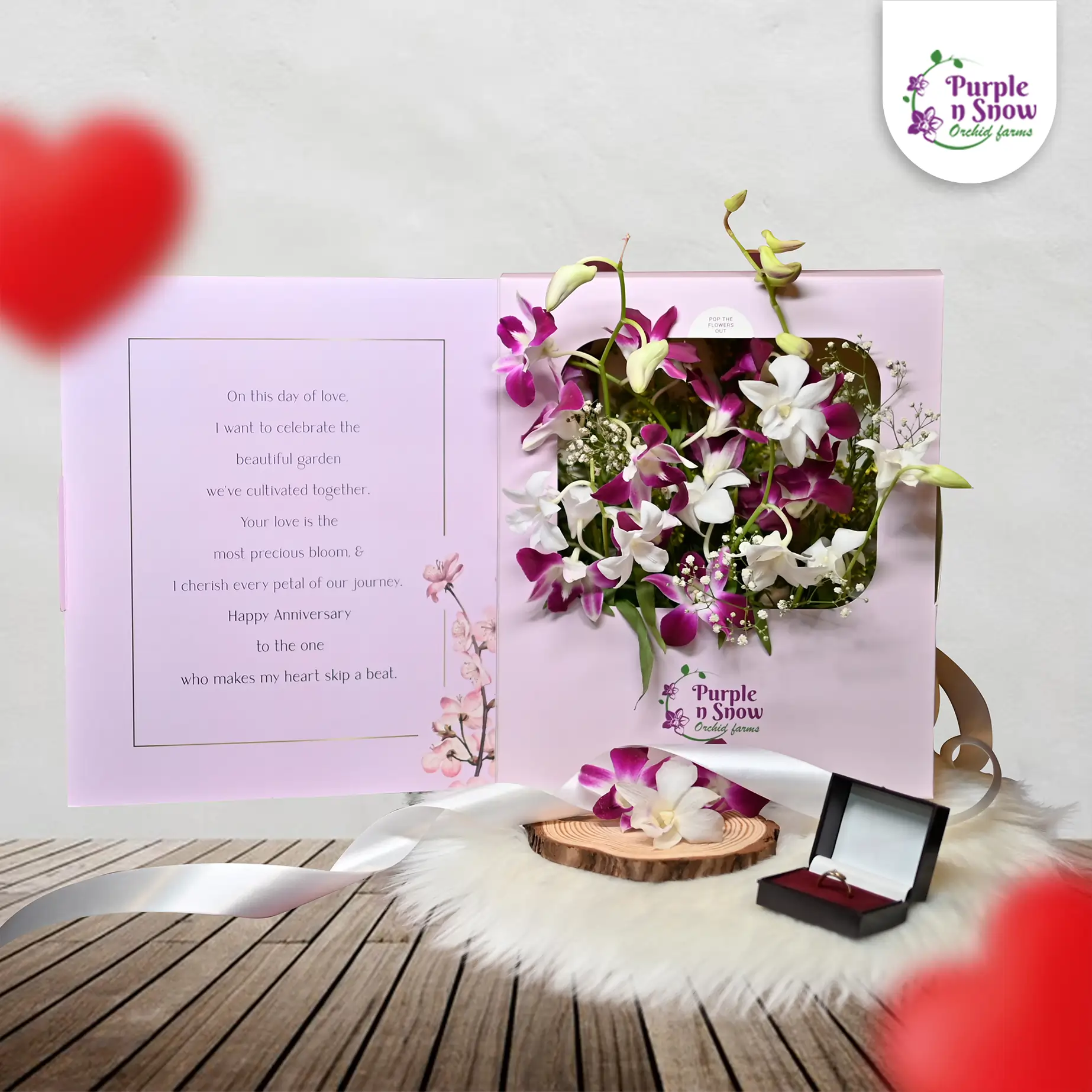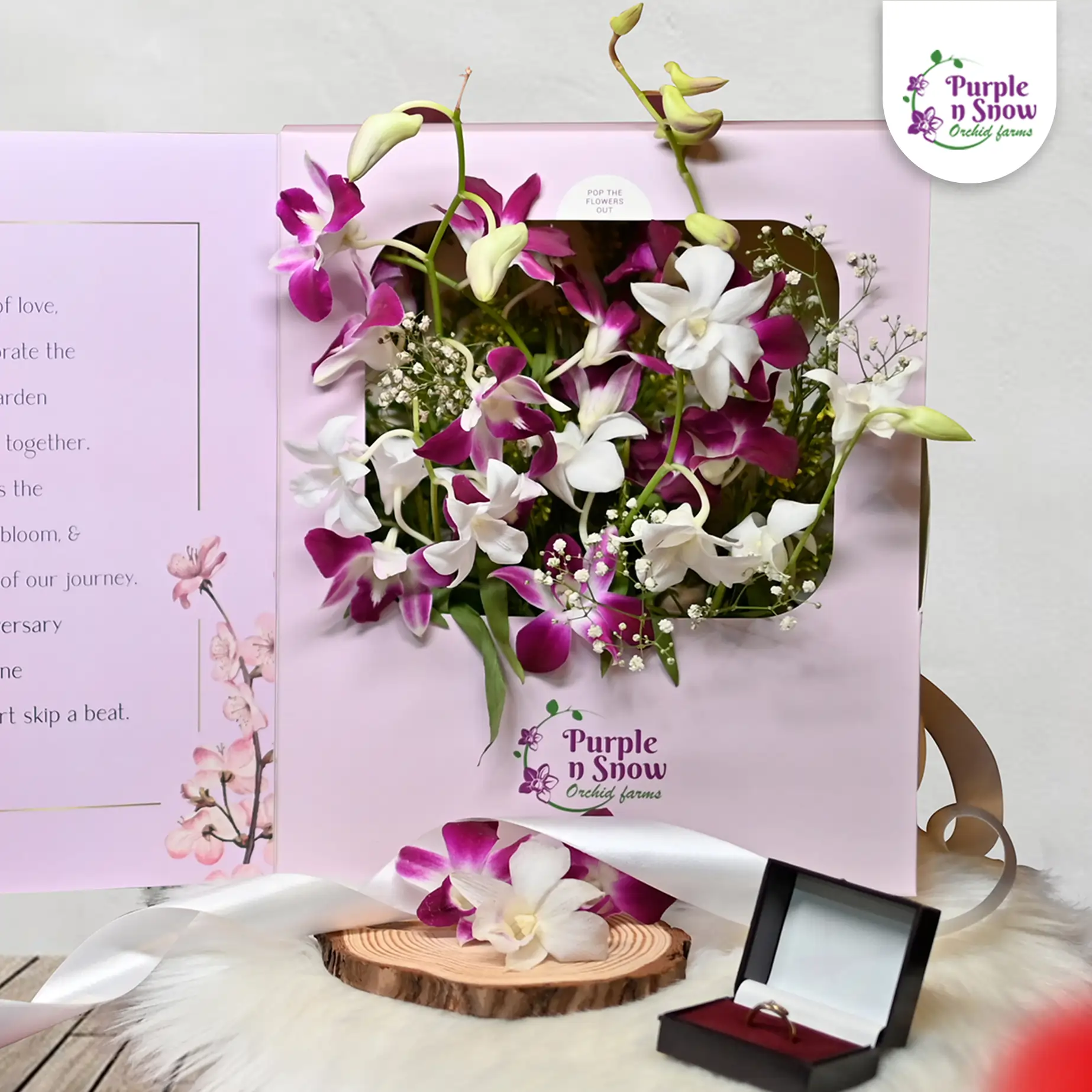 Express your love with our exquisite Orchid Flower Box, crafted for the ultimate anniversary celebration. Inside, you’ll find vibrant purple and white orchids, carefully selected for their captivating beauty and long-lasting freshness. Alongside these stunning blooms is a greeting message, perfect for expressing your heartfelt sentiments. Celebrate your love story with a gift that combines elegance and thoughtfulness.